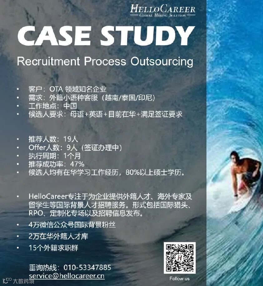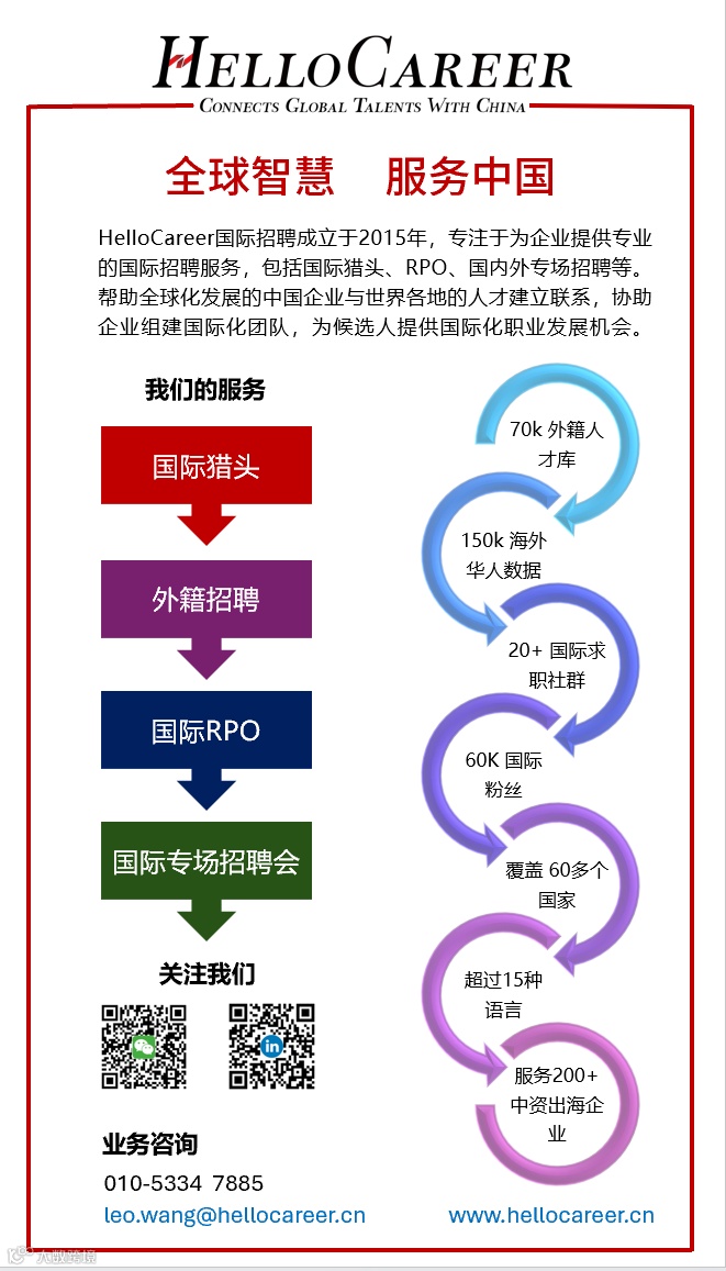 HelloCareer在海外团队组建和跨国引才方面拥有丰富的实战经验,并且致力于国际招聘、雇主品牌、中外职场文化、国际人才职业发展等领域的调研和洞察。