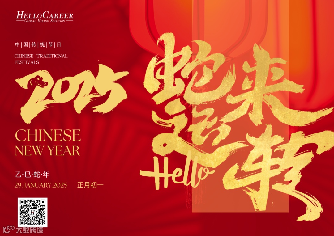 在过去的一年,我们共同经历了挑战与成长。值此新春佳节之际,HelloCareer衷心祝愿您和您的家人蛇年大吉,身体健康,万事如意!愿您在新的一年里,事业蒸蒸日上,生活充满欢笑与阳光。