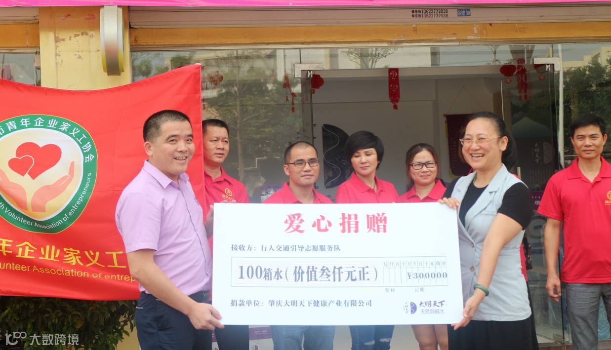 由大明天下董事长江灿权先生代表捐赠弱碱水100箱,四会市社工委副主任杜展屏女士代表行人交通引导志愿者服务队接受100箱弱碱水。