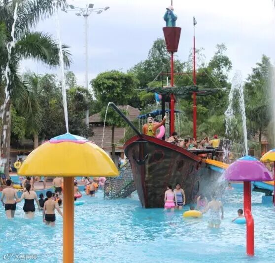 激情水寨,具有大翻斗、水炮、风水盘等多项功能,最刺激的是最顶端的两个大铁桶,当水注满铁桶后会自动一倾而下,这时会引来无数的欢呼声,身处其下的游客也可体验一下“中头彩”的美妙感觉。