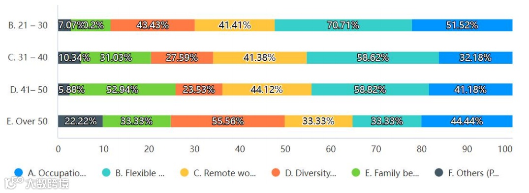 将年龄作为自变量与福利偏好进行交叉分析,我们可以发现30岁以下的职场新人最关注是否拥有灵活的办公时间和空间,对职场安全和健康的重视也高于其他年龄层。