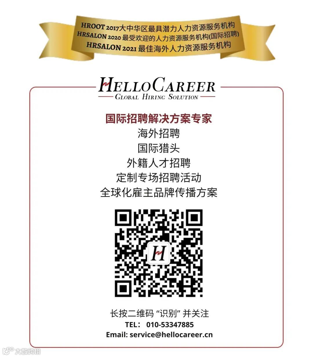 HelloCareer致力于成为中国企业和机构吸引海外优质人才的一站式专业平台,通过不断丰富公司自有资源,同时整合不同国家和地区的外部资源,HelloCareer已经成功为TMT、汽车及零部件、科技制造、金融投资、大健康等不同行业的近百家公司和机构提供了定制化的国际人才招聘服务,帮助若干出海中资企业梳理海外招聘需求、组建海外团队或招募海外专业人才。