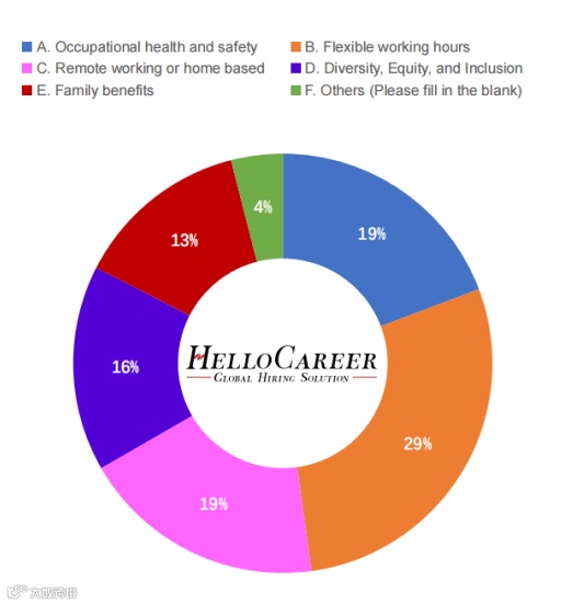 在HelloCareer近期的调研中,“灵活的办公时间” 占比接近30%成为国际职场人士最青睐的职场福利。而受疫情影响,“远程工作或居家办公” 和“职场健康安全”则得票不相上下,同样受到国际人士的关注。