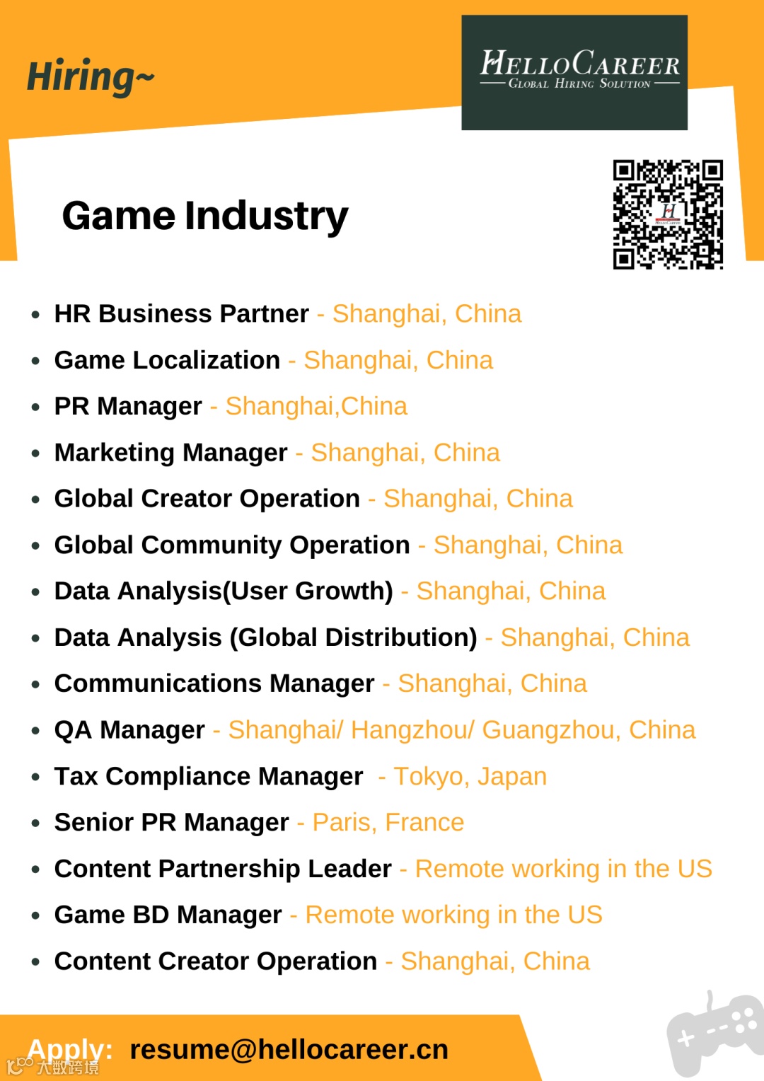 Hot Job| PR Manager (Game Industry)- Shanghai HelloCareer国际招聘