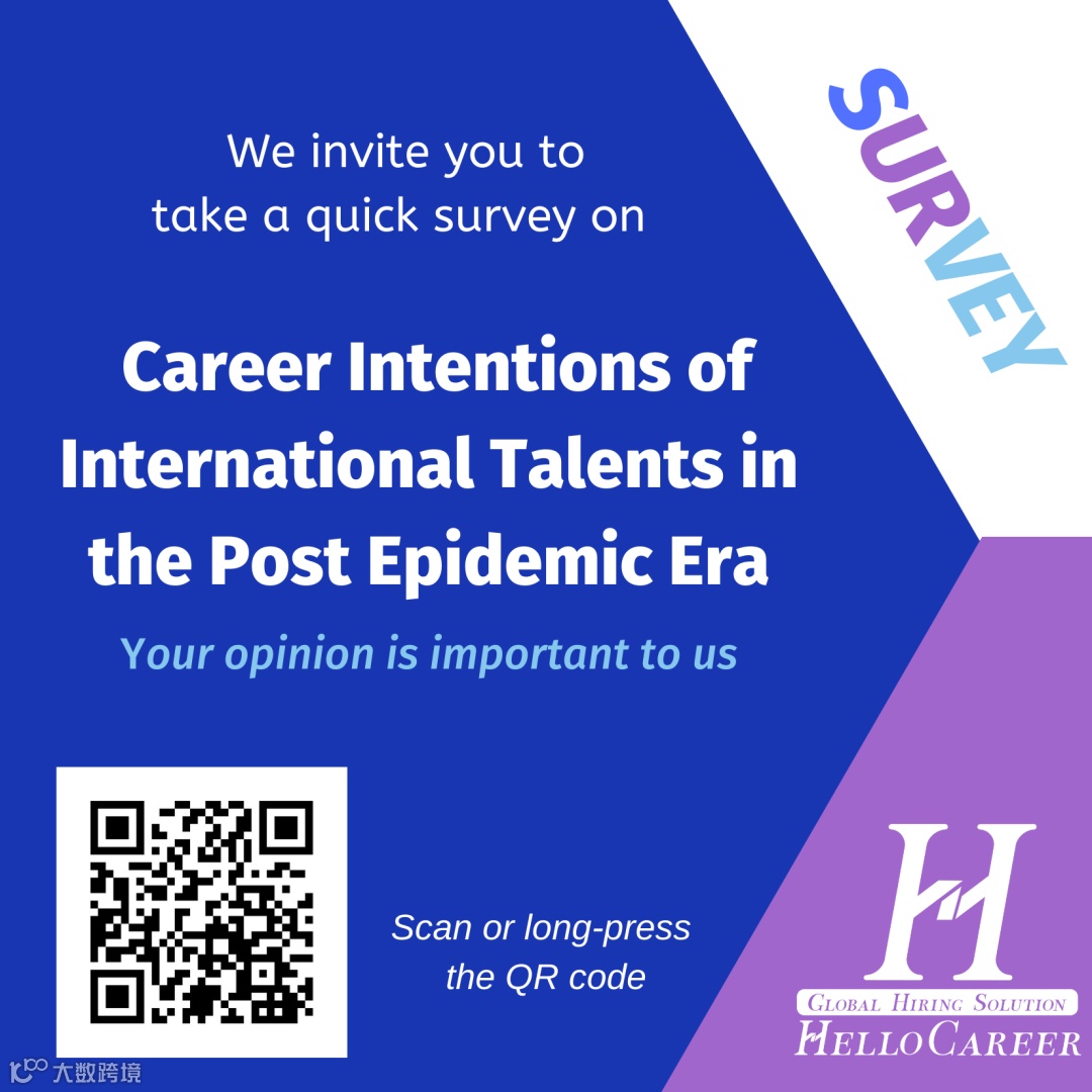 HelloCareer is a global talent hiring solutions provider. In order to help Chinese enterprises and institutions better understand the workplace preference and career development intentions of international talents in the post epidemic era, we sincerely invite you to spare several minutes to help us complete the above questionnaire. To protect your privacy, we will not ask for your name, contact information and other sensitive information.