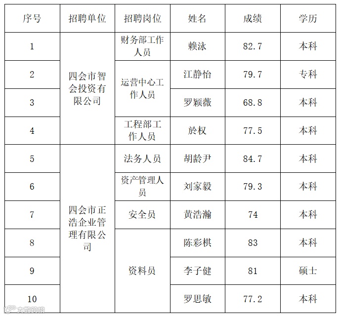 在四会市国有资产管理有限公司的信任与委托下,我方秉持着专业、严谨的态度,圆满完成了本次岗位招募面试相关工作。经过严格且规范的资格审查和面试流程,现公布本次面试的拟录用人员名单。为充分体现招聘工作的公平、公正、公开原则,广泛接受社会监督,受四会市国有资产管理有限公司委托,现将拟录用人员名单予以公示。
