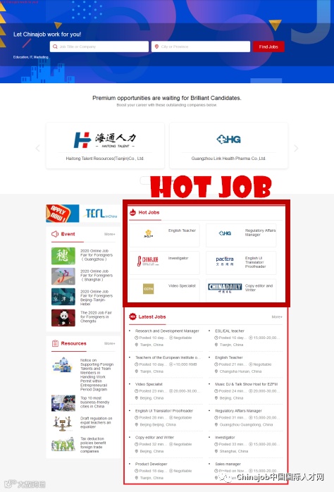 活动预告及入口。实时更新如外籍人才招聘会(The Job Fair for Foreigners)以及外籍语言教师(英语类)职业培训(TEFL in China)等活动信息,求职者和用人单位可通过特定入口报名参加。