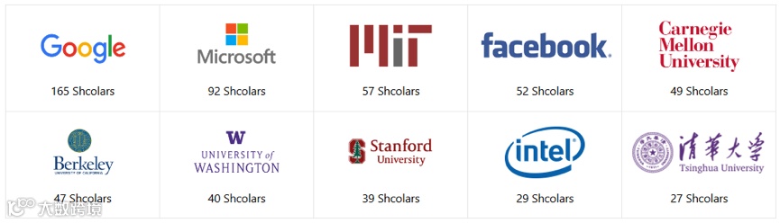 从机构影响力来看,位居首位的是谷歌公司,共171人入选榜单,也是唯一一家学者人数过百的机构。微软、麻省理工学院、Facebook等机构紧随其后。前十名里的中国机构只有清华大学,其余均为美国研究机构。
