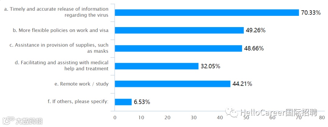 The timely and accurate release of epidemic information is what everyone most desires. In addition, they hope that relevant parties can help provide epidemic prevention materials. Besides that, more flexible employment and visa policies have a rate of almost 50%.