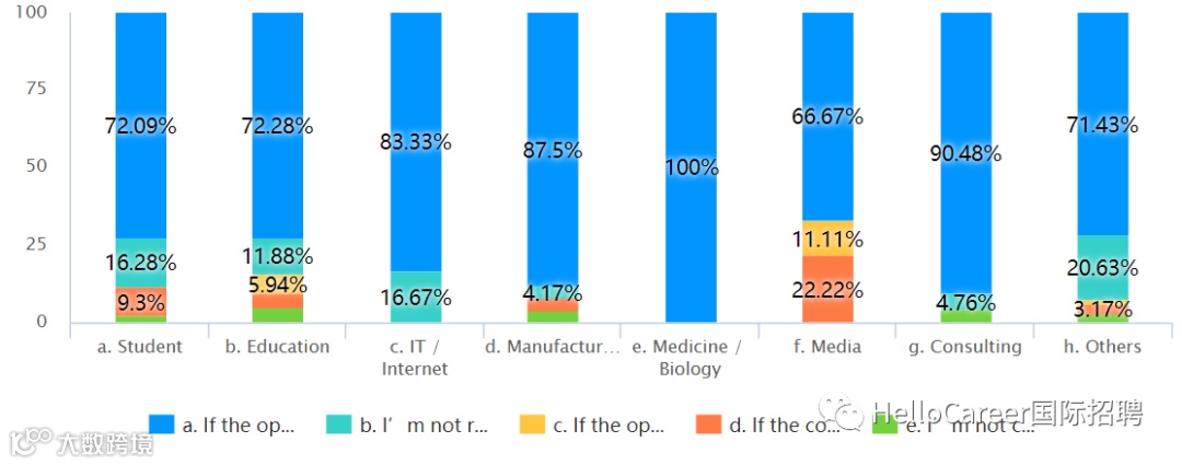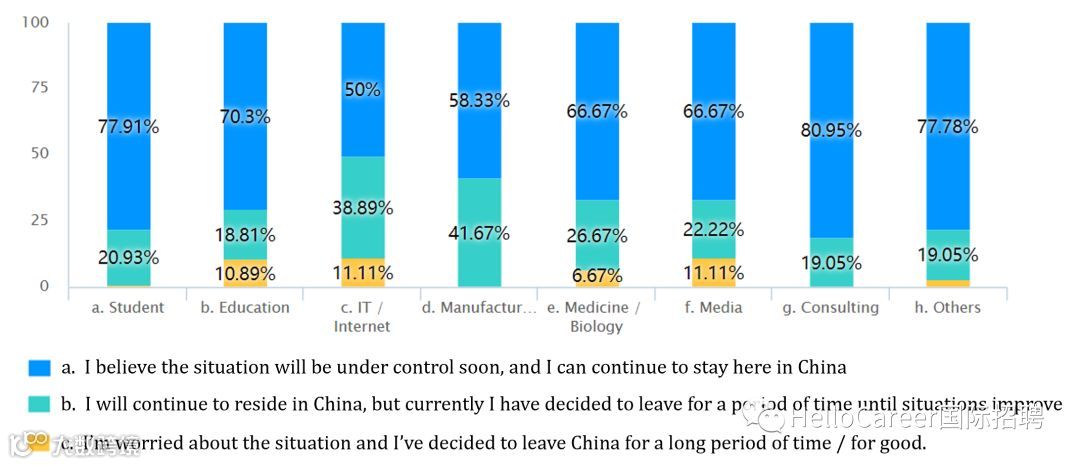 It is worth noting that although only a small number of foreign talents in the biomedical industry intend to temporarily leave China to avoid the epidemic, all of them believe that they still have a good opportunity to work in China. We think that it is likely that because of their knowledge background, not only that these people are more sensitive to the topics of infectious diseases, but they are also relatively objective and rational, and will not change their career plans because of fear. Compared with other industries, media practitioners prefer to spend the current stage remotely or part-time.