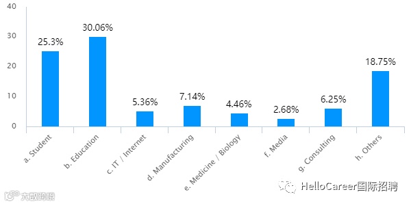 Among the foreign talents participating in the survey, the proportion of foreigners studying in China is currently about 25%. Except for international students, the largest number are practitioners in the education industry, accounting for 30%, while other industries are relatively scattere. And this generally conforms to the current industry / vocational distribution of foreign talents in China.