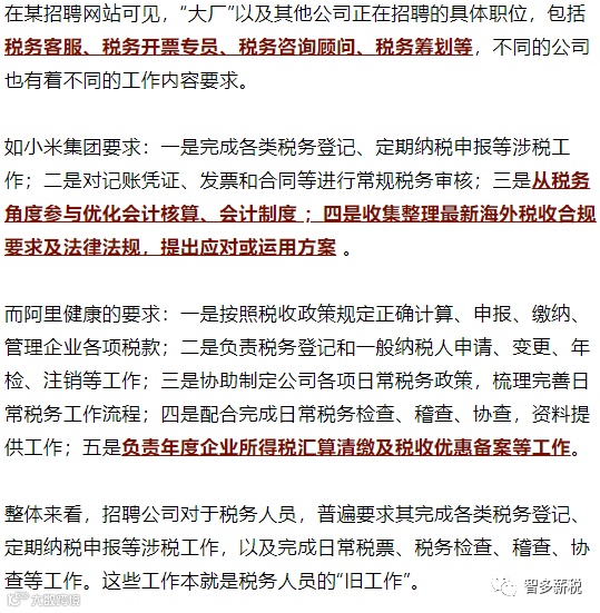 最后,需要注意的是,上述“大厂”和其他公司正在招聘的特定税务人员,和普通的会计人员也存在一定差别。虽然“税务”和“会计”的工作内容有一定的重合之处,但是当前公司招聘的税务人员更加侧重“办税”,包括日常税务申报,统计报表申报,重点税源报表申报、税务登记注销变更、税务筹划、税收优惠申请等事项,而会计人员则更加侧重财务核算等业务。