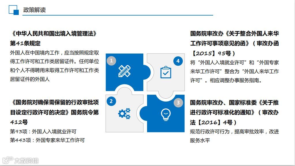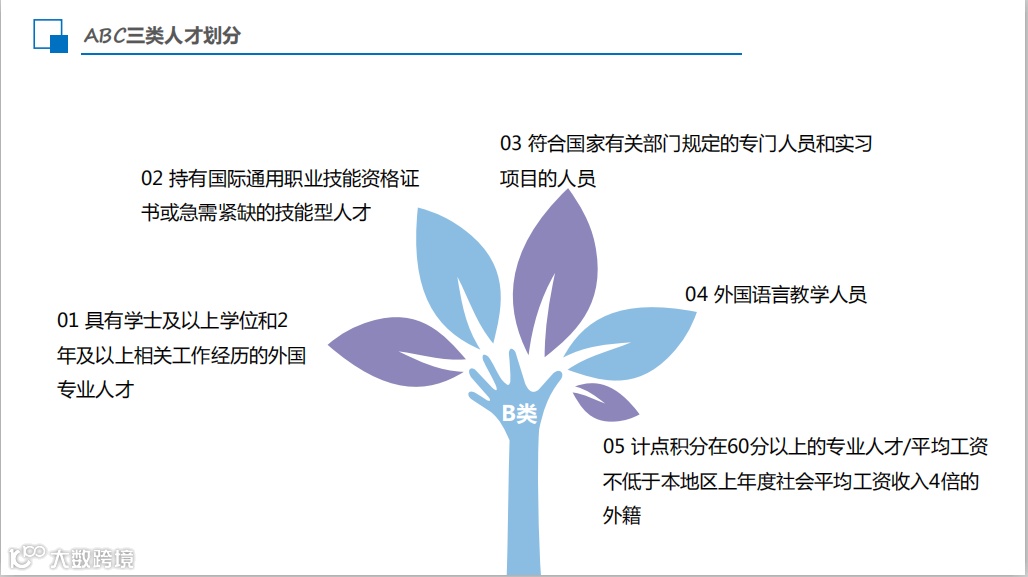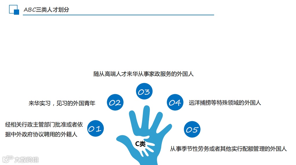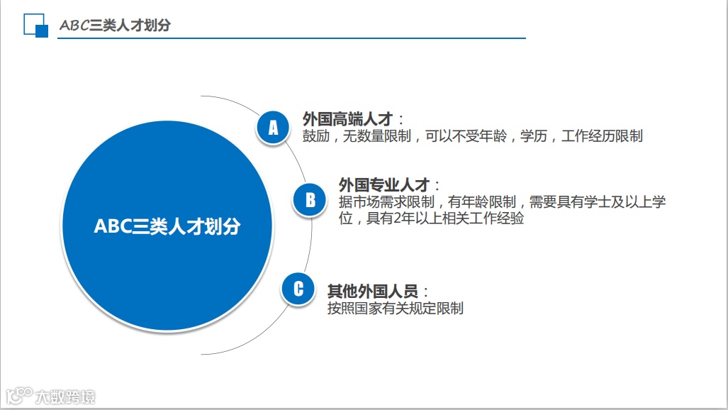 2017年以来,政府部门对于在华就业外籍人逐步实行统一办理流程,优化服务。建立科学、实用的外国人才评估体系,注重能力、实绩和贡献,突出市场评价,国际同行评价等市场需求,综合运用计点积分制、外国人在中国工作指导目录、劳动力市场测试和配额管理等,将来华工作外国人分为三类,按标准实行分类管理。