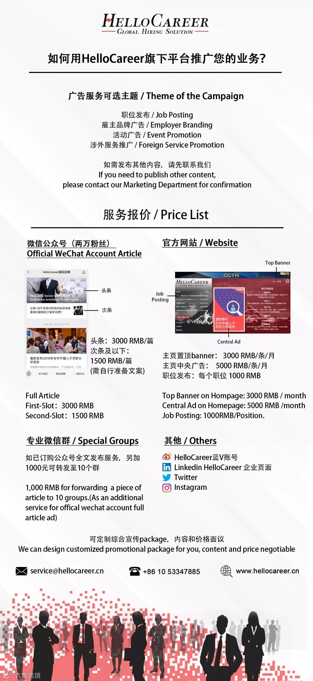 我们的广告服务也于近日正式推出: 没错,您可以用HelloCareer旗下平台推广您的业务啦。