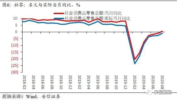 8月社会消费品零售名义增速0.5%,实际增速-1.1%,均较上月回升1.6个百分点。