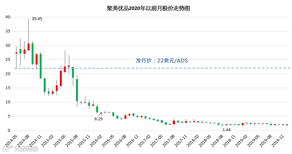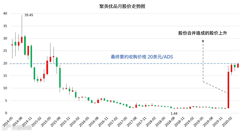 虽然第二次私有化价格回到20美元/ADS,但由于聚美优品在提出第二次私有化方案的前两天执行了股份合并,将原先1股普通股对应1股ADS的比例,修改为10股普通股合并成为1股ADS,因此若将价格还原,第二次私有化的价格相当于合并前2美元/ADS的价格。