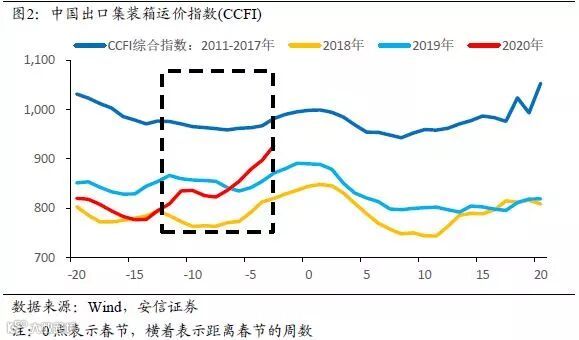 2020年春节提前对于12月出口同比影响如何?我们认为春节效应可能对12月出口的影响有限。证据来自于CCFI综合指数,该指数在接近春节时会出现上升。但是一方面,2020年CCFI综合指数的上升远远大于历史趋势;另一方面,该指数与我国PMI指数均在大约两个月前出现回升。