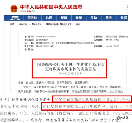 国务院办公厅:2020年底前基本实现增值税专用发票电子化