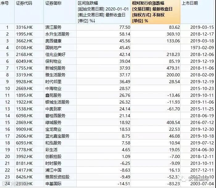 尽管在2020年有新冠病毒疫情对股市的负面影响,但港股市场上的物业公司还是大部分实现了强势上涨。截止2020年2月20日收市,滨江服务在港交所物业服务和管理板块中今年以来的涨跌幅夺冠,区间涨幅高达77.5%。