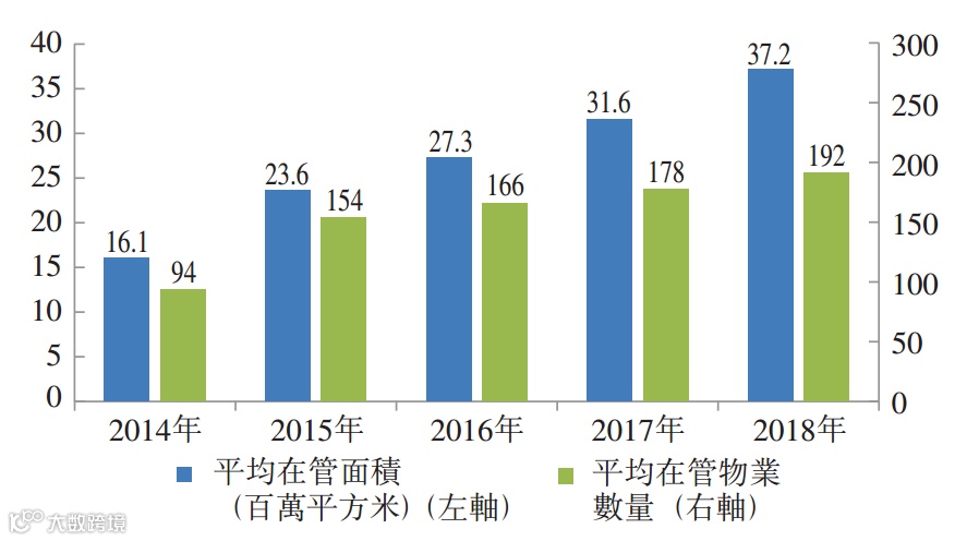 近年来,随着中国城市化进程加快及人均可支配收入的持续增长,物业服务百强企业的在管面积和在管物业数量快速增长。根据中指院的资料,物业服务百强企业管理的平均在管面积从2014年的16.1百万平方米增至2018年的37.2百万平方米,复合年增长率为23.3%。