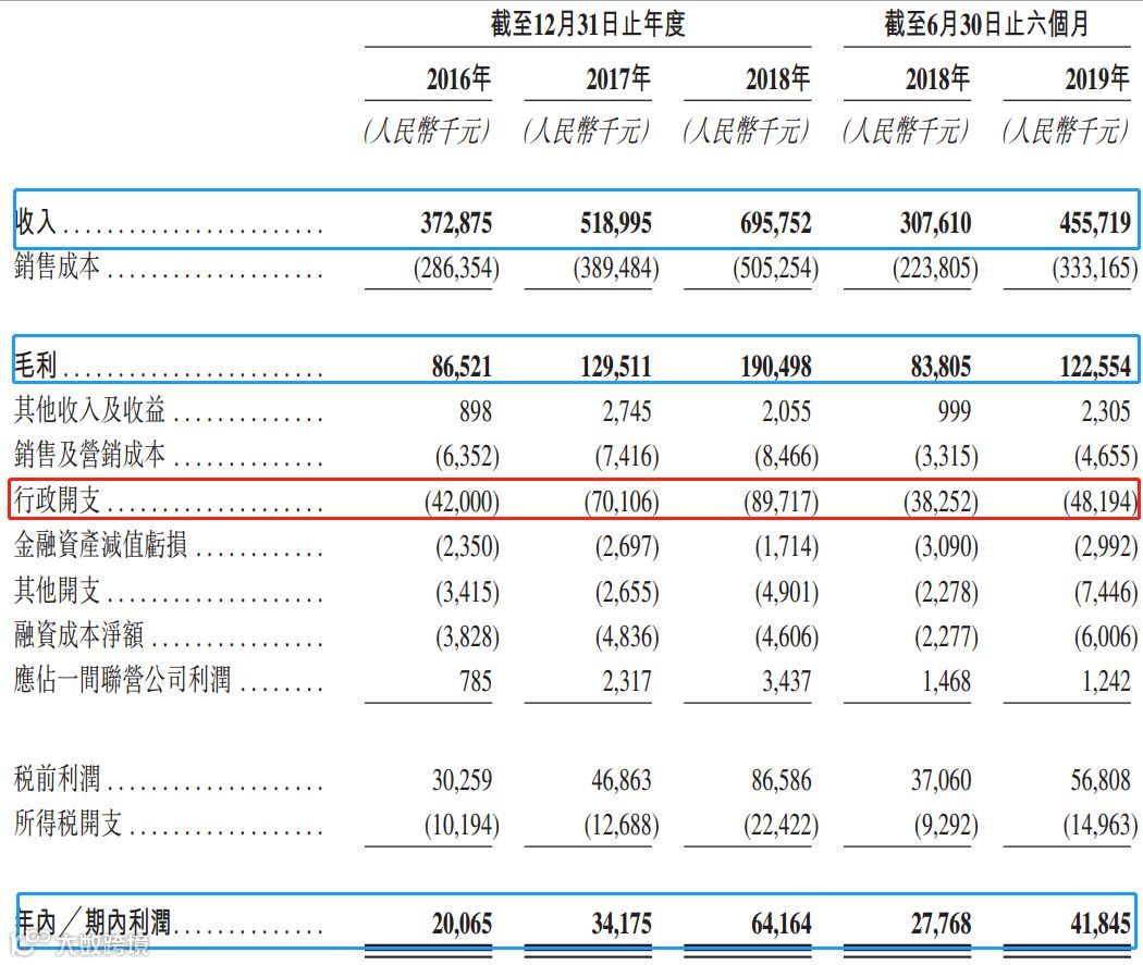 于往绩记录期间,时代邻里业绩增长迅速,收入从2016年的3.73亿元增至2018年的6.96亿元,年复合增长率为36.6%,2019年上半年公司收入增长48.1%至4.56亿元。