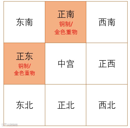 今年正南和正东分别为五黄灾星及二黑病星位,二者皆对健康不利,必须注意家中梳化、睡床及公司中的坐向是否处于这两个方向,因为在病位长期坐卧皆会容易引发大病小痛。所以,正南和正东皆要避忌动土及拜访红黄两色物品,宜放铜质或金色重物加以化解。