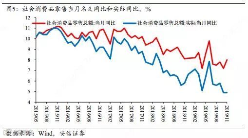 11月社会消费品零售名义增速8.0%,较上月回升0.8个百分点;实际增速4.9%,与上月持平,实际消费增速维持年内低点。