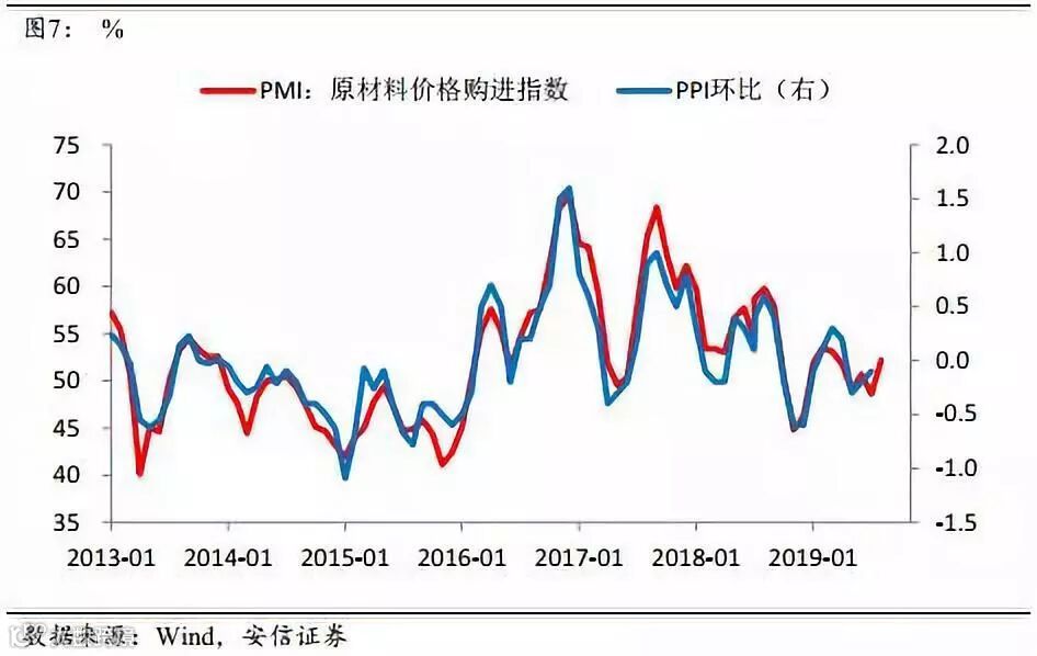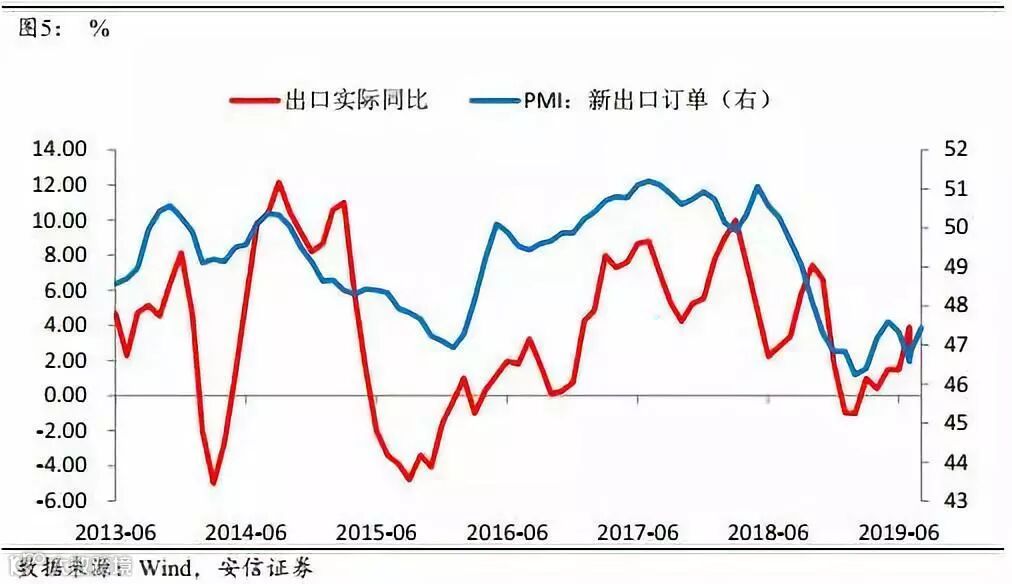 在贸易摩擦和全球经济走弱的压力之下,PMI的新出口订单指数却连续三个月回升,这是市场的一个关注点和困惑之处。首先,我们把新出口订单和剔除价格后的实际出口同比进行对照,发现两者在2019年都是企稳并略有回升的,说明出口可能确实比预期要略强。