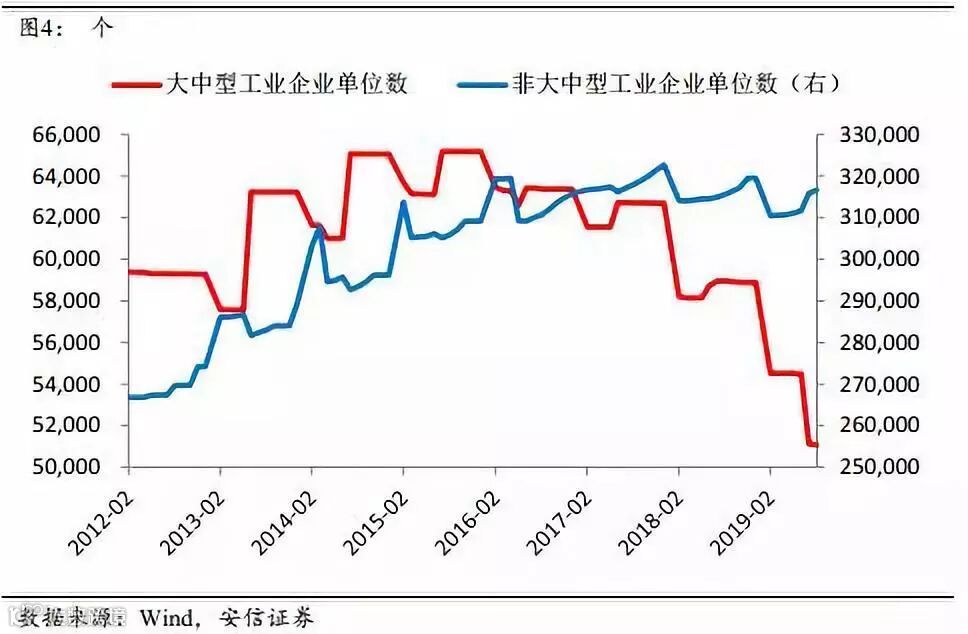 我们认为,这可能和幸存者偏差问题有关。2018年之后,统计局公布的企业单位数发生了明显的变化。大中型工业企业的单位数急剧下降,两年内减少了接近20%。非大中型工业企业的单位数也结束了上升的势头,转为下降;如果用按照之前的趋势线性外推得到的单位数作为参照,非大中型工业企业的数量减少也接近10%。如果减少的企业是相对较差的企业,那么就会产生幸存者偏差的问题,导致PMI被高估,而工业增加值则影响不大。