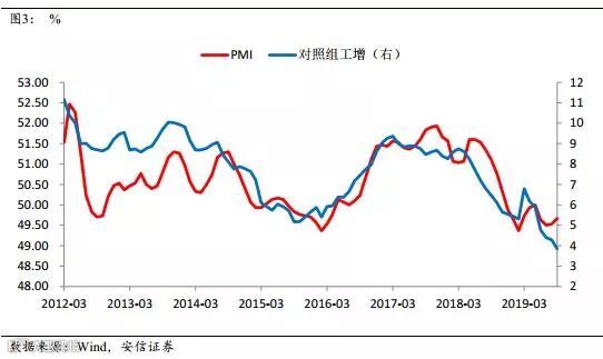 2016年以来的供给侧改革导致了供改行业的工业增加值增速受到了较为明显的扰动。因此,我们将非供改行业(对照组)的工业增速与PMI进行比照。我们发现,这两个指标的走势还是基本吻合的,但在最近两年出现了较为明显的背离。2018上半年和2019年二三季度,非供改行业的工业增加值增速明显下行,但PMI读数基本平稳。