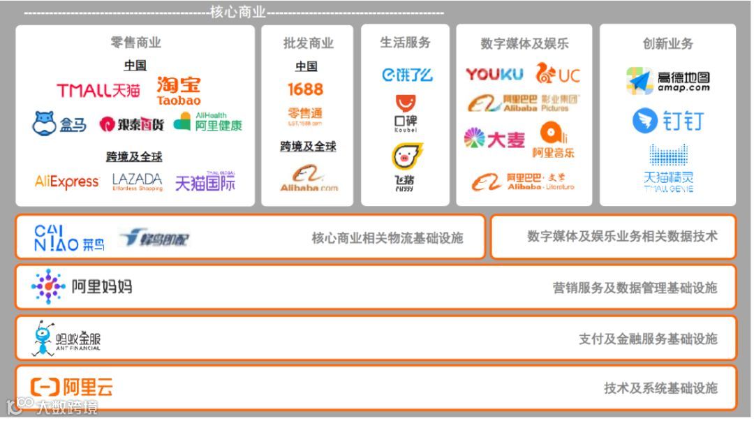 阿里巴巴业务分为核心商务、云计算、数字媒体和娱乐业务以及创新业务及其他。阿里巴巴通过四大业务板块的布局,构建了完善的商业操作系统。阿里云为技术和系统提供基础设施支持,蚂蚁金服提供支付和金融服务支持,阿里妈妈提供营销服务和数据管理平台,菜鸟网络提供物流服务。天猫、淘宝、优酷、高德等则提了全面的商业、娱乐、出行等服务。