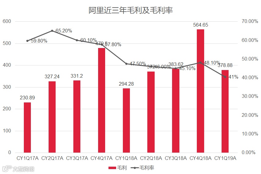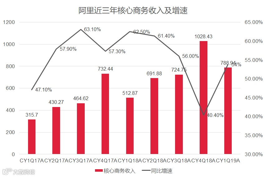 FY19Q4(对应CY19Q1)总收入为935亿元,同比增长51.0%,环比减少20.3%,高于市场预期2.0%,增长主要来自国内新零售、阿里云,以及同比新并入饿了么业绩;FY19全年总收入为3768.4亿元,同比增长50.6%。