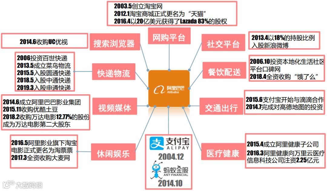 5、蚂蚁金融服务集团起步于2004年成立的支付宝,2013年3月,支付宝的母公司宣布将以其为主体筹建小微金融服务集团,小微金融(筹)成为蚂蚁金服的前身。2014年10月,蚂蚁金服正式成立。蚂蚁金服旗下有支付宝、余额宝、招财宝、蚂蚁聚宝、网商银行、蚂蚁花呗、芝麻信用等子业务板块。同年,2014年9月19日,阿里巴巴在纽交所实现上市(不包括蚂蚁金服),市值超过1680亿美元。蚂蚁金服的成立,标志着金融生态闭环的完成,而衍生出来的五大板块也能构造强大的用户黏性。