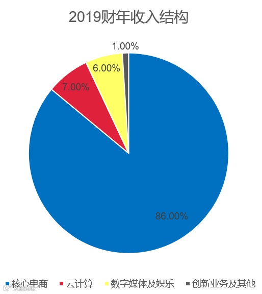 从2019财年收入占比来看,核心电商业务占比最大,占比86%。但是收入占比在逐渐降低,从 FY2014 的 95%下降到 FY2019 的 86%。主要是其他三大板块的收入在增加,特别是云计算板块的收入从 FY2014的 1%上升到 FY2019的7%。