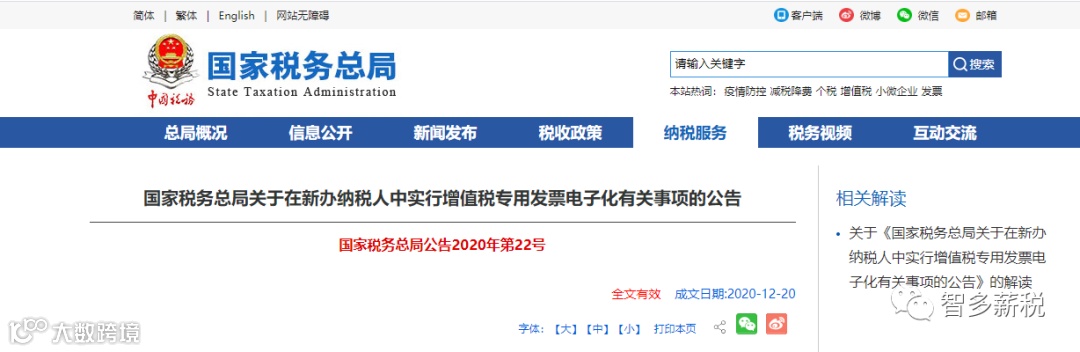 为全面落实《优化营商环境条例》,深化税收领域“放管服”改革,加大推广使用电子发票的力度,国家税务总局决定在前期宁波、石家庄和杭州等3个地区试点的基础上,在全国新设立登记的纳税人(以下简称“新办纳税人”)中实行增值税专用发票电子化(以下简称“专票电子化”)。现将有关事项公告如下: