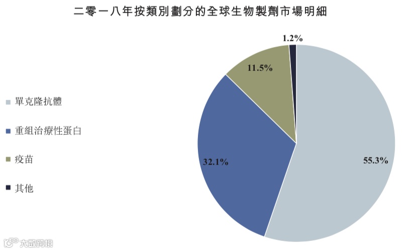 在所有生物制剂中,单克隆抗体是全球生物制剂市场最大分部,占2018年销售收入的55.3%。