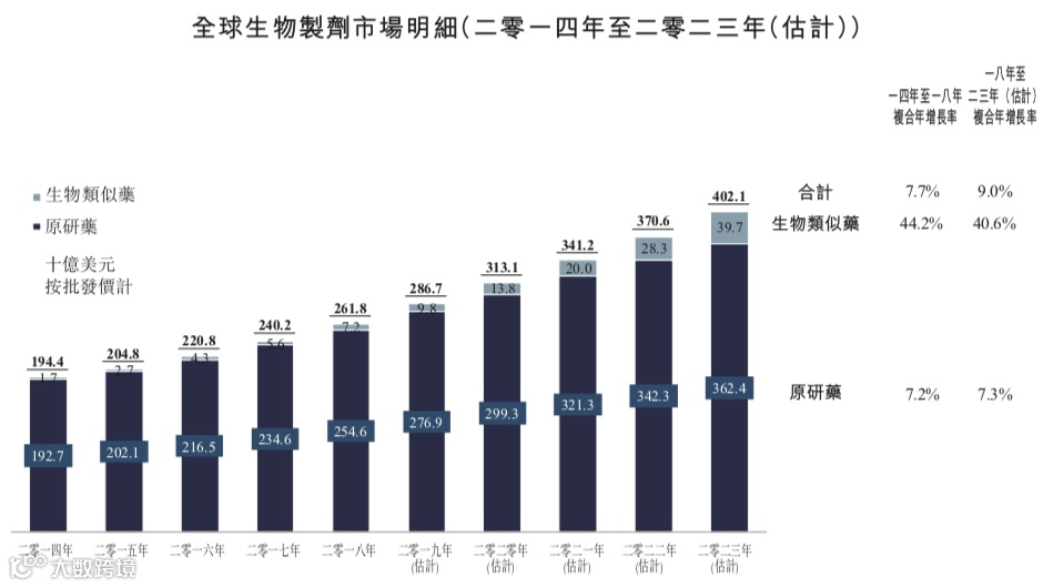 全球生物制剂市场从2014年的1,944亿美元增至2018年的2,618亿美元,复合年增长率7.7%。这一趋势预计将会持续。
