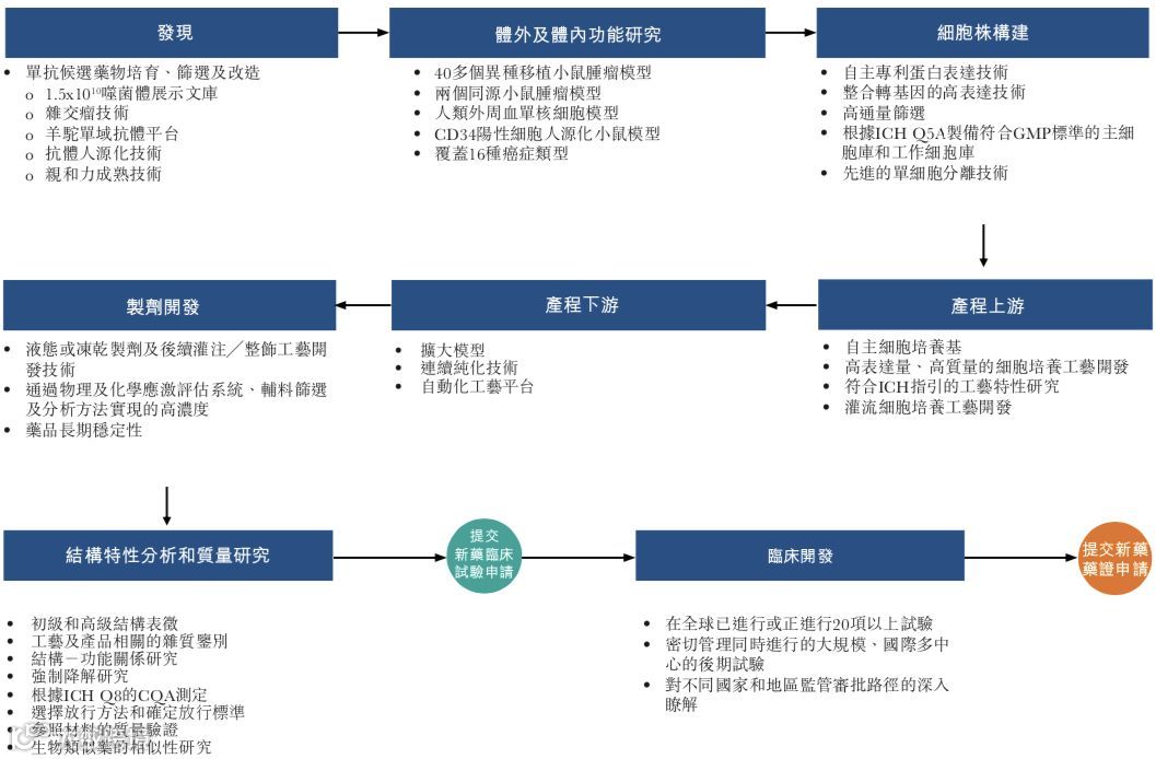 公司的全球研发平台以及自主研发能力使其成为中国为数不多的能够覆盖整个产品开发流程(由早期候选产品筛选到最终新药药证申请备案及批准)研发的生物制药公司之一。研发流程详情如下: