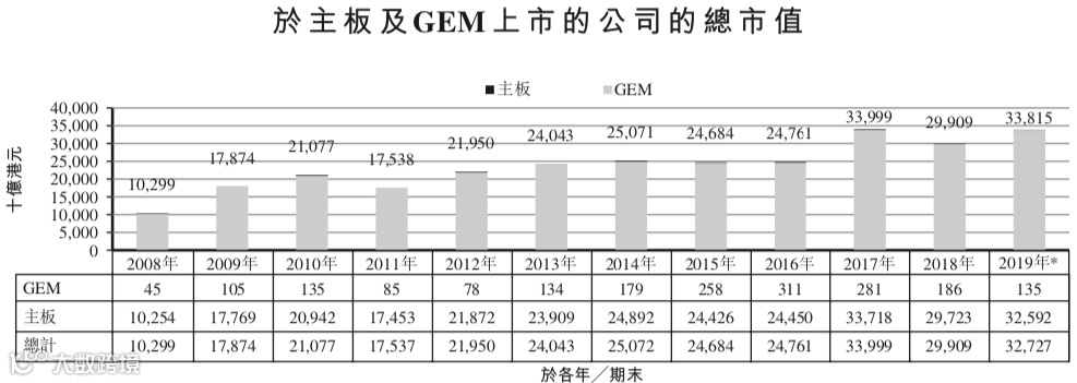 于2019年6月30日,主板及GEM上市公司的市值分别约为325,917亿港元及1,350亿港元,主板总市值佔约99.6%。