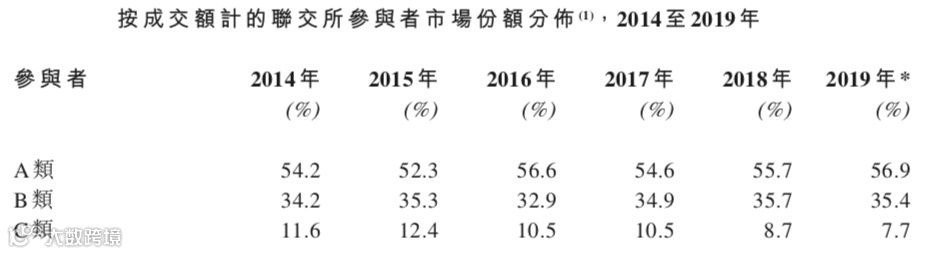 联交所将联交所参与者按其地位分为三个类别:A类(前14家公司);B类(第15至65家);C类(其他)。公司属于C类参与者,目前的C类参与者的市场份额约为7.7%。