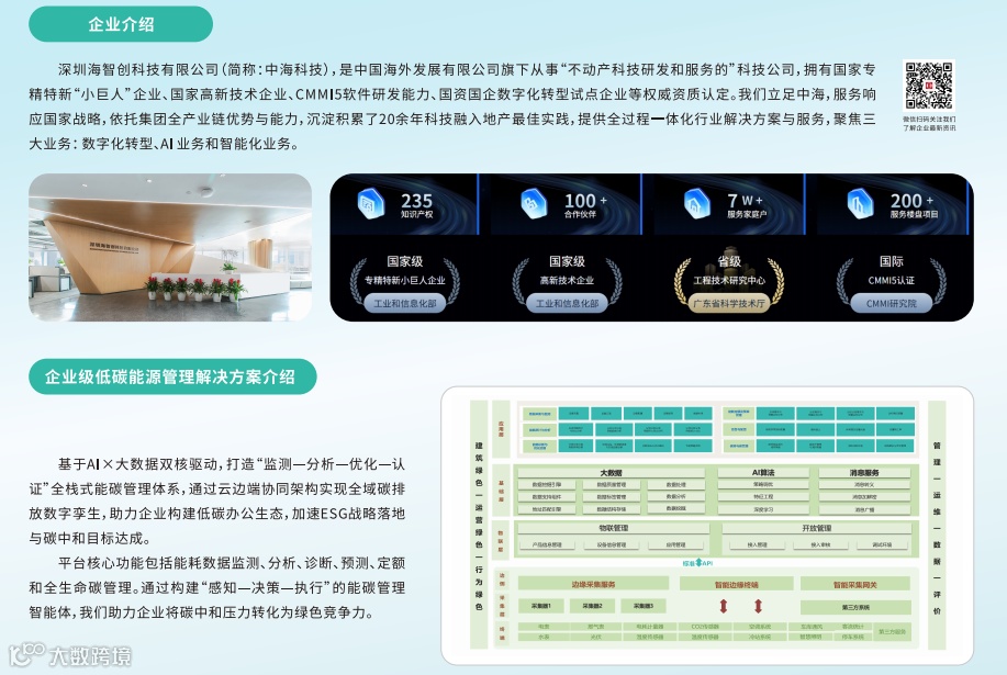 深圳海智创科技有限公司(简称“中海科技”)是中国海外发展有限公司旗下专注于不动产科技研发与服务的国家高新技术企业,致力于通过数字化转型、AI与智能化技术,为行业提供绿色、高效的解决方案,推动可持续发展。