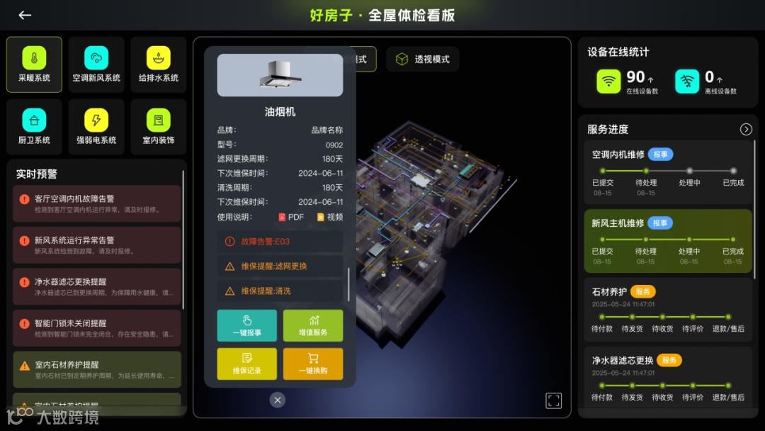 全屋体检系统:实时监测每台设备的"心跳",创新融合BIM+IoT技术,从设计-采购-施工-运维的全周期数据都沉淀在 BIM 系统中,房屋零部件的材质、型号、厂家等信息都可以一键查看、一键溯源、一键报修、一键下单更换。