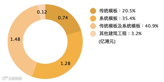 公司主要的收入来源为模板工程,近三个财年及2018/19财年前9个月收入分别为1.65亿、3.72亿、3.5及2.96亿港元,2017/18财年模板工程收入占比达96.8%。2017/18财年收入分布如下: