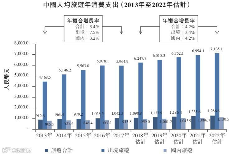 2018-2022年间,中国出境旅游的游客人均消费支出预计将增至7135.1元,年复合增长率为3.4%。同期,中国国内旅游的游客人均消费支出预计将增至1130.5元,年符合增长率为4.2%。