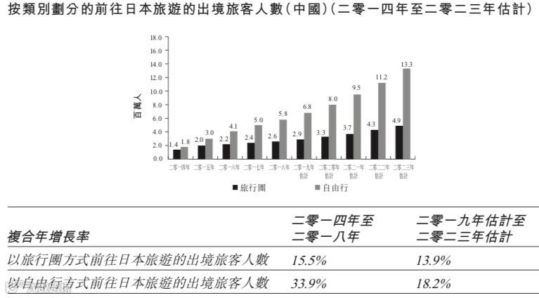 2014-2018年期间,以旅行团及自由行方式前往日本旅游的出境旅客人数迅速增长,以旅行团方式前往日本旅游的出境旅客人数增至2.6百万人,复合年增长率15.5%,以自由行方式前往日本旅游的出境旅客人数增至5.8百万人,复合年增长率33.9%。随著2019年实施对中 国旅客到日本旅游的签证申请放宽及2020年东京奥运的来临,前往日本旅游的出境旅客人数预期进一步增长。
