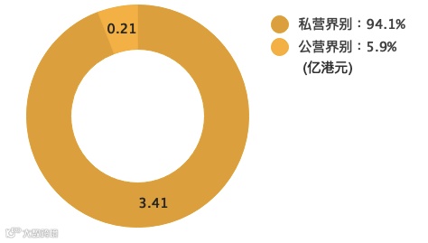 银涛控股项目的最终拥有人来自私营界别及公营界别(包括政府及法定机构)。近三个财年及2018/19财年前9个月,来自私营界别收益占比分别为62.1%、53.7%、94.1%及88.9%,由公私营界别均衡发展,转变为以私营界别为主导的业务模式。2017/18财年收入分布如下: