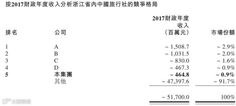 公司是中国知名及活跃的出境旅游产品及服务供应商,特别专注于向华东客户提供日本旅行团及自由行相关产品。于2018财年,以日本出境旅游收益计,公司于华东排第五,占华东出境旅行社的日本旅游总收益约1.2%。