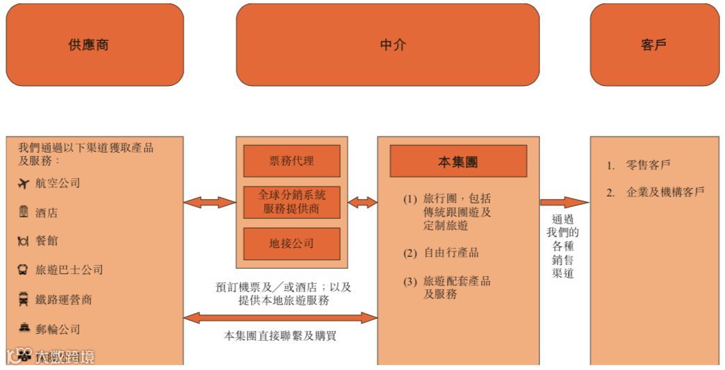 公司向零售客户以及企业及机构客户(如地方企业、公司及政府机构)提供旅游相关产品和服务,向供应商(包括但不限于航空公司、票务代理、酒店运营商、全球分销系统服务提供商和地接公司)采购产品及服务。下图为公司的业务模式:
