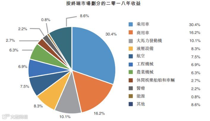 公司在世界各地拥有15个工厂,3个销售办事处,在中国、北美、卢森堡和土耳其拥有仓储能力,增长来源于下游终端市场需求的增长,下游行业主要聚焦于汽车、航空及液压市场,按收益乘用车、商用车、大马力发动机占比分别达30.4%、16.2%和10.1%。