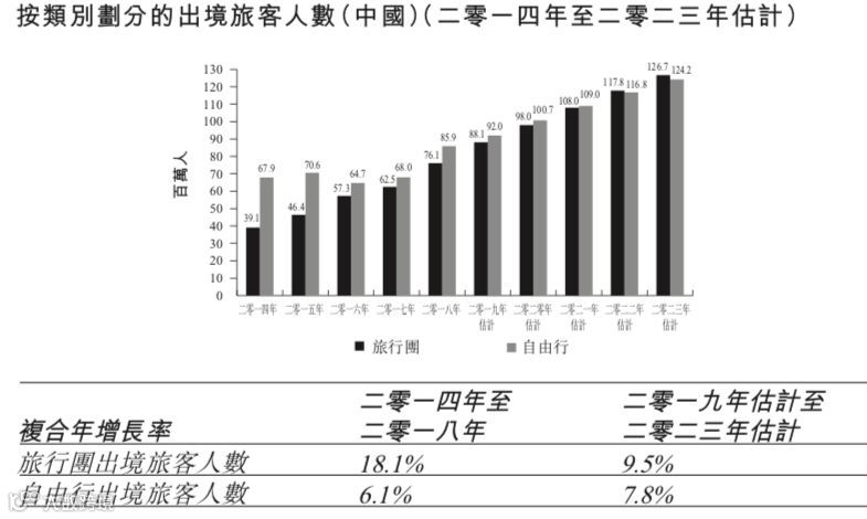 参加旅行团的出境旅客人数由2014年的约39.1百万人上升至2018年的26.1百万人,复合年增长率为18.1%,并预期于2023年前达到约126.7百万人。出境自由行旅客人数由2014年的约67.9百万人上升至2018年的85.9百万人,复合年增长率6.1%。2023年自由行出境旅客人数预测将达约124.2百万人。